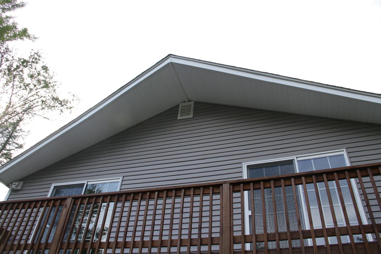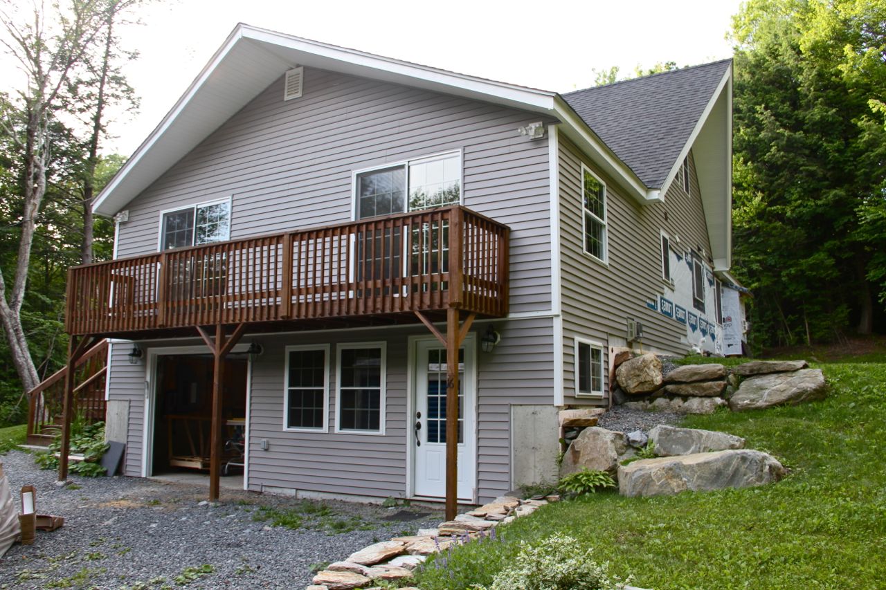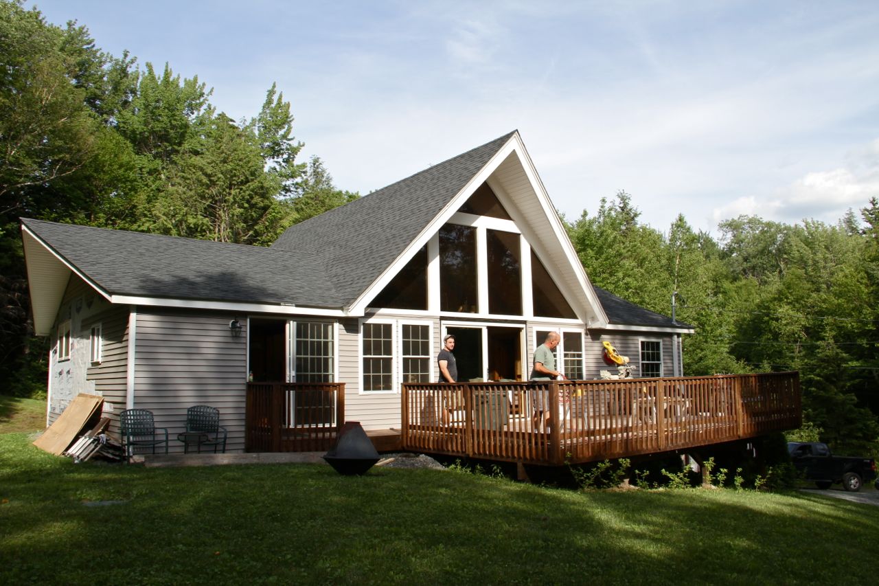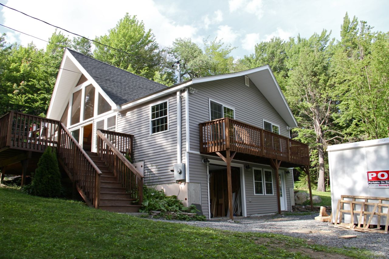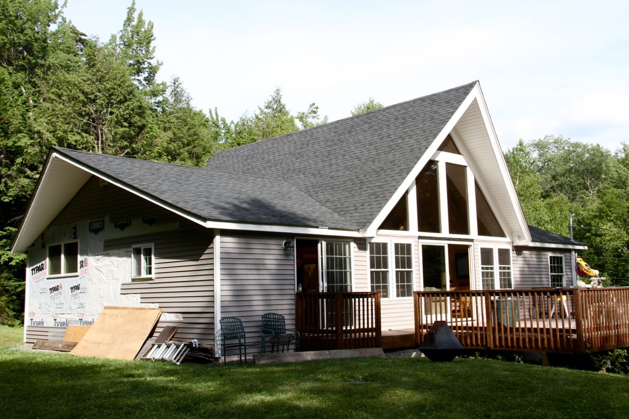 DURING: siding and roofing replaced in time for winter; decking and landscaping phase continued in the summer months.