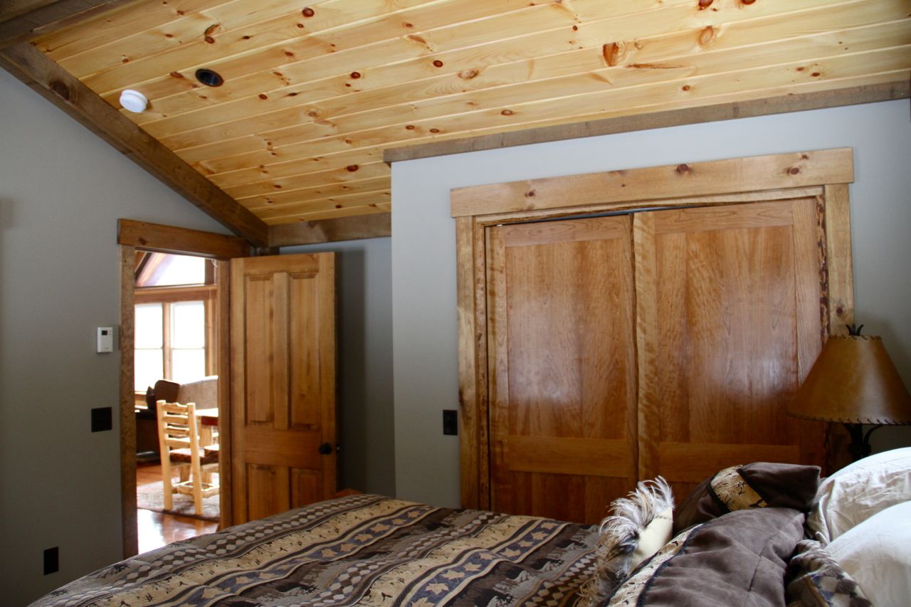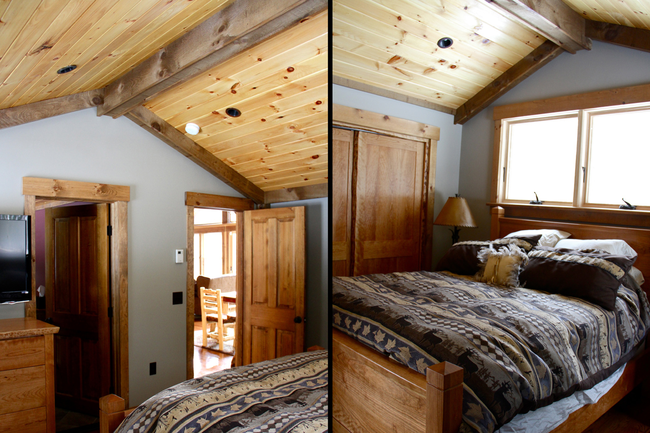 Interior, the ceilings began as simple sheetrock. Clear coated pine with hefty beams emphasizes the vaulted ceiling and cabin feel.