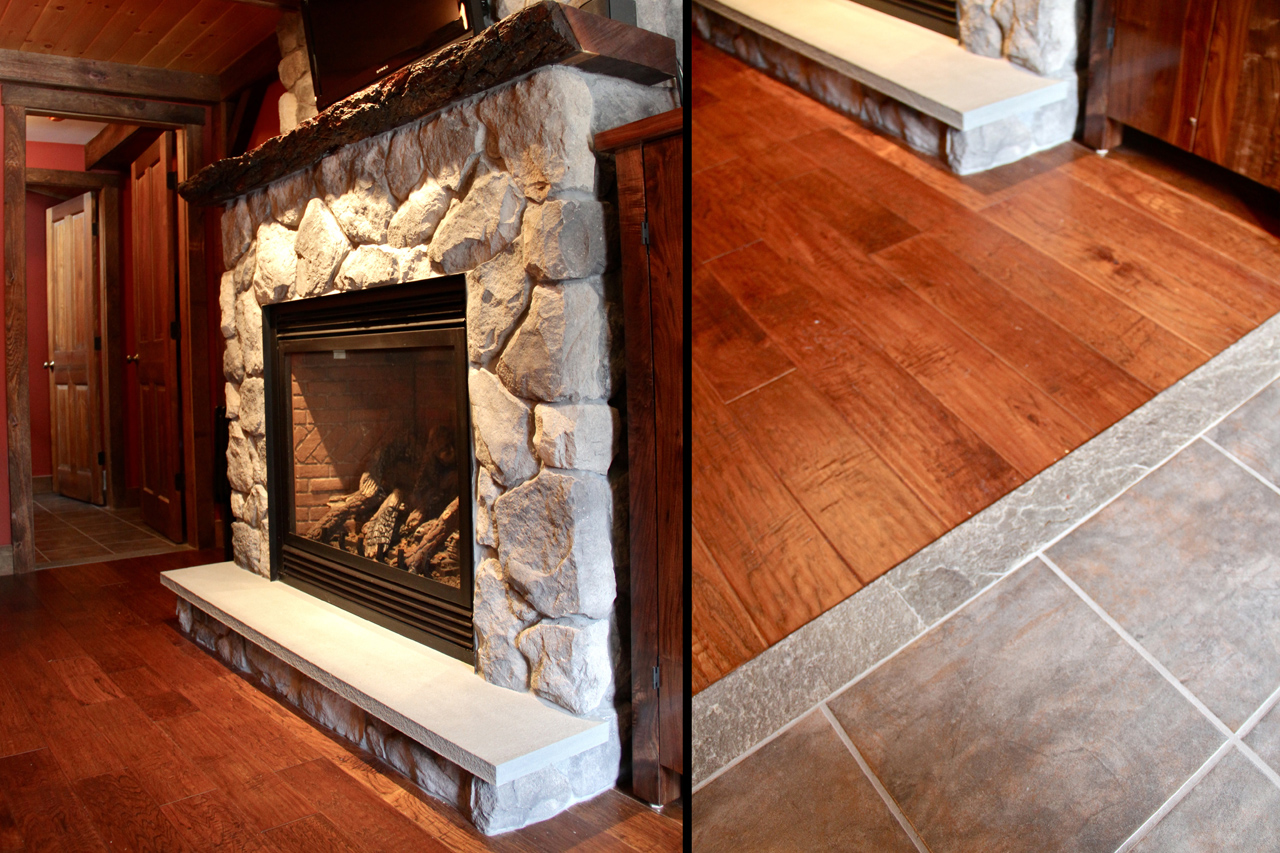 Custom fireplace hearth was built for this family room; a heated tile entrance was installed with custom pre-finished flooring for a seamless transition.