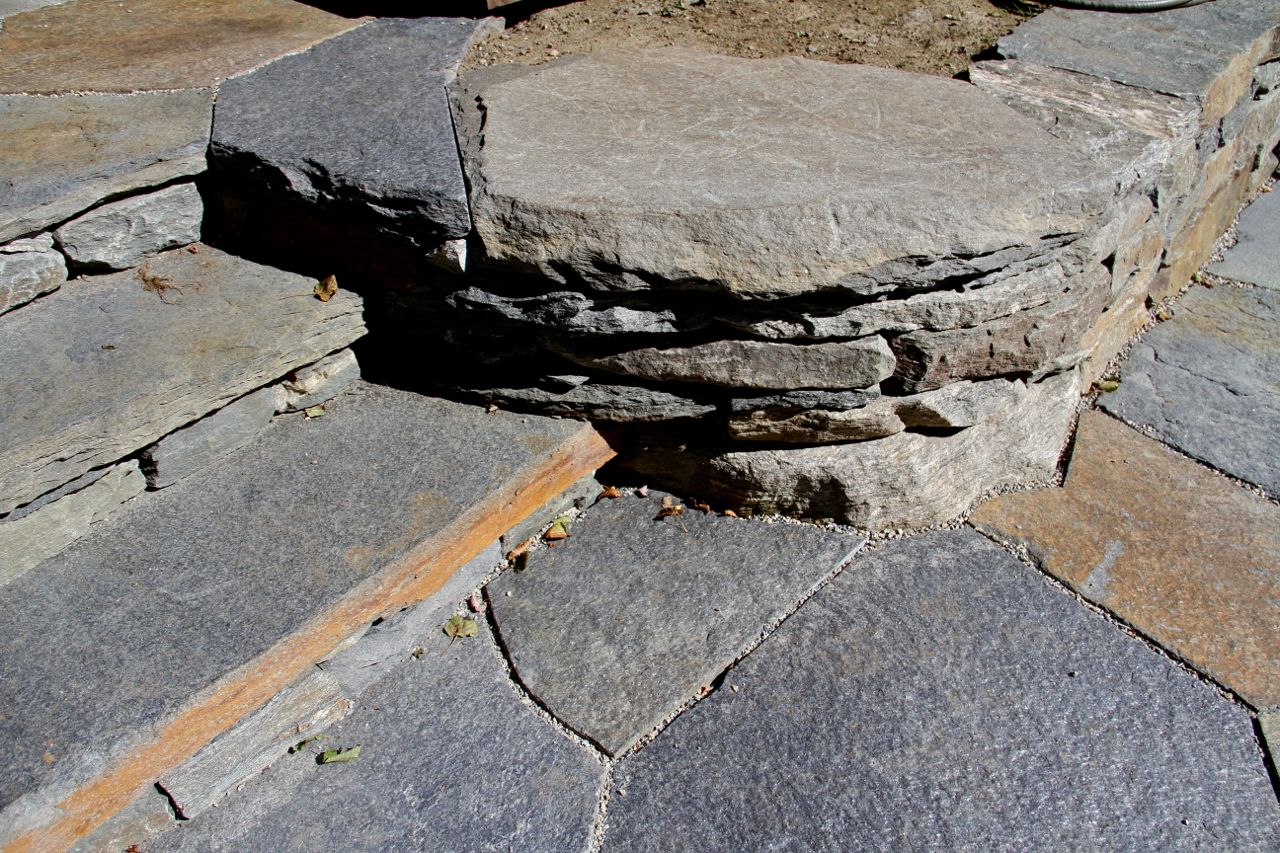 Custom stonework includes a heated walkway to the yet to be complete (in progress) hot tub suite.