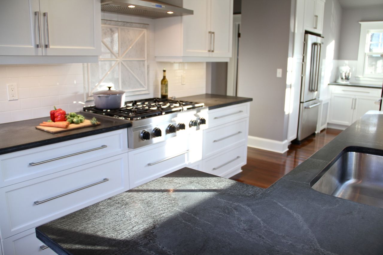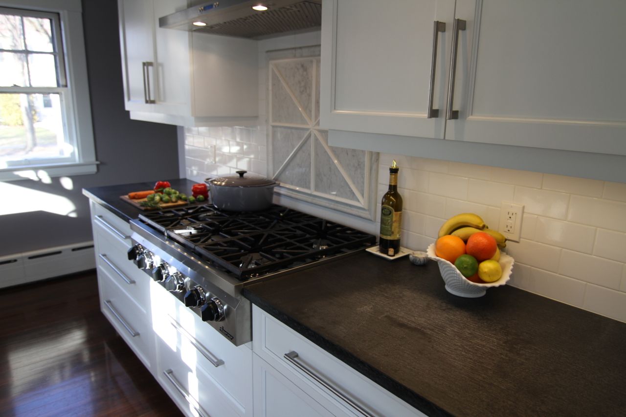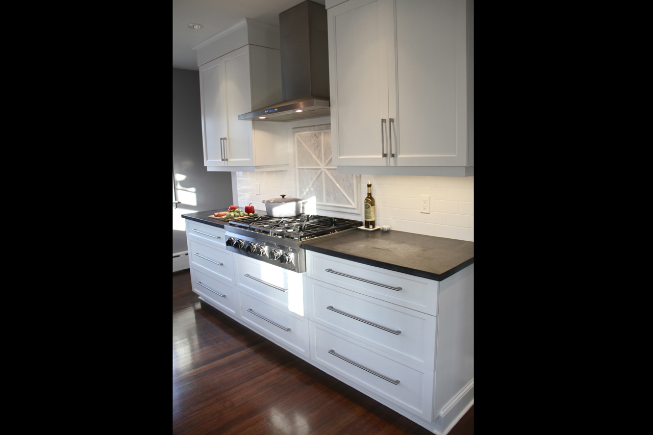 An inefficient floor plan, old appliances, and dated, crumbling finishes made for a dramatic transformation. This 1920s home was both restored and updated at the same time with custom matched millwork, restored original flooring, revamped layout – including doing away with the former maid’s quarters – and locally quarried stone countertops.