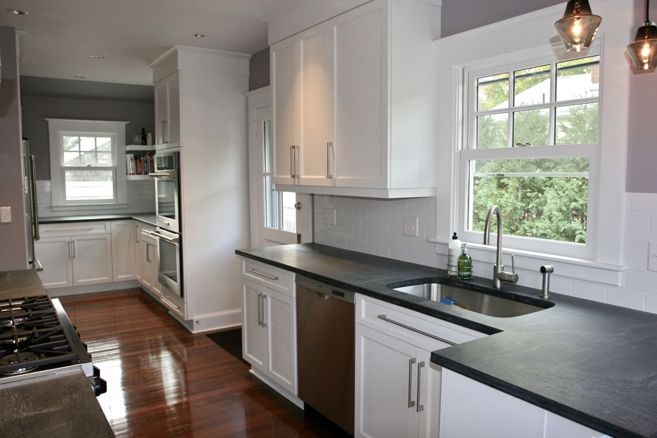 AFTER, kitchen facing south-west. New windows were installed to match the existing windows in the rest of the house, with custom matched millwork to replicate the original 1920s woodwork.