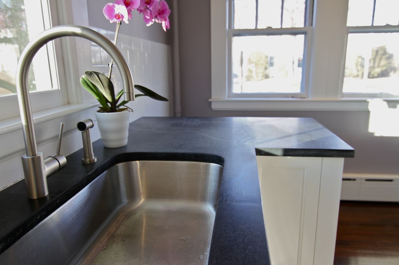 The countertops are from Ashfield, MA, and are local to the area. The peninsula provides an eat-in area perfect for quick breakfasts, or enjoying a glass of wine with the cook.