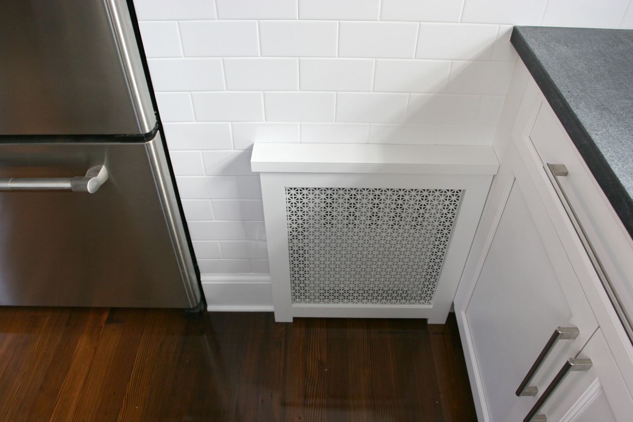 This heater was salvaged from the original kitchen, and refitted for the rear of the kitchen. We enclosed it, and custom built a removable radiator cover.