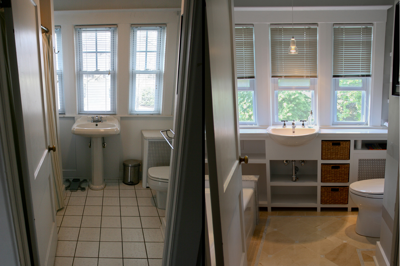 Left, BEFORE: the family bathroom was at least 20 years old. Right, AFTER: custom vanity cabinet, marble flooring, new plumbing fixtures and updated lighting update this space for a modern family.