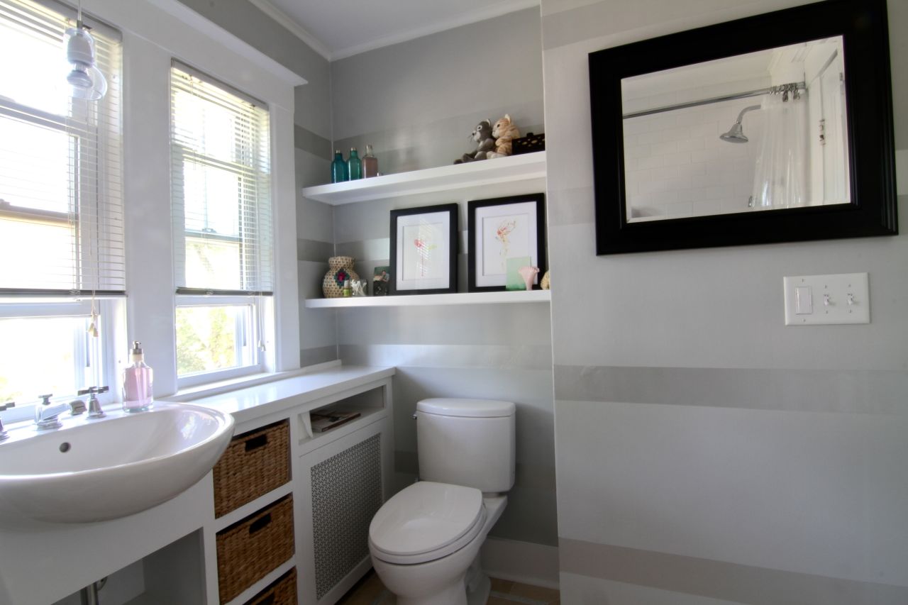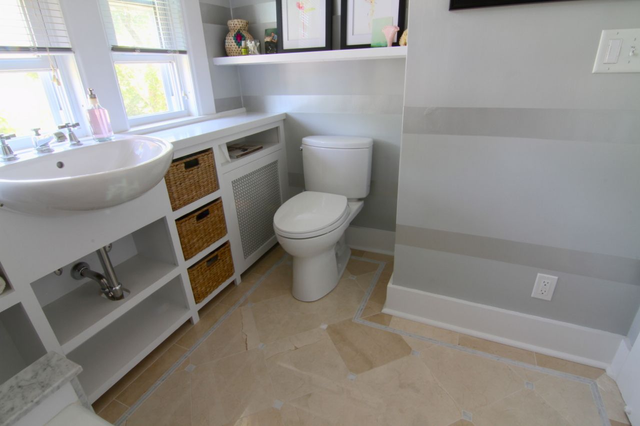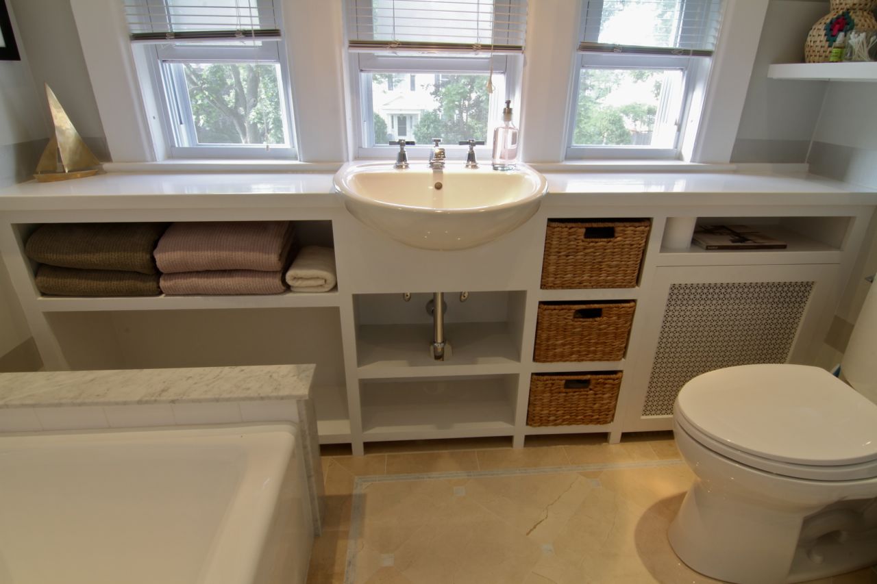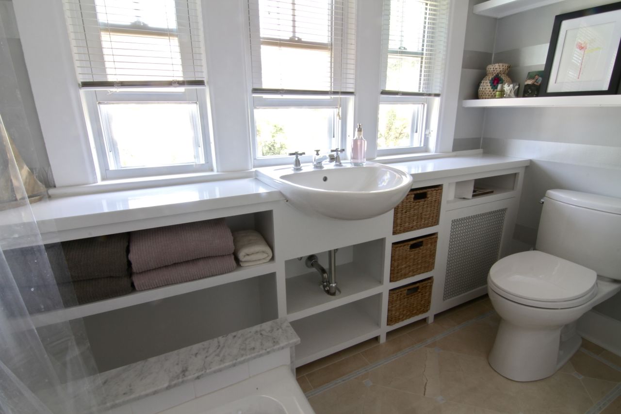 The family bath features a custom built vanity with open storage, basket storage, butcher-block countertops, and a removable panel which hides the existing radiator.