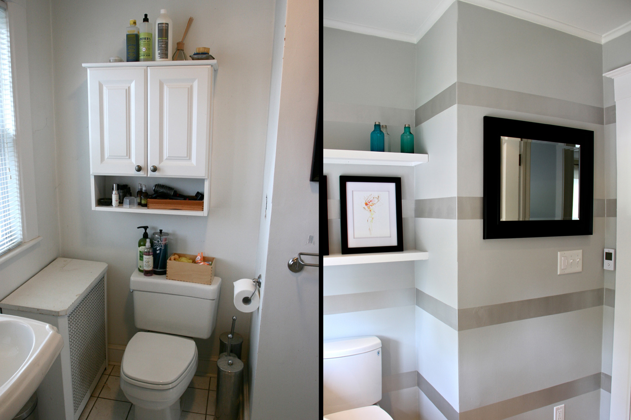 Custom shelves make the most of the space above the commode, and the built-in cabinet extends the counterspace from wall to wall.