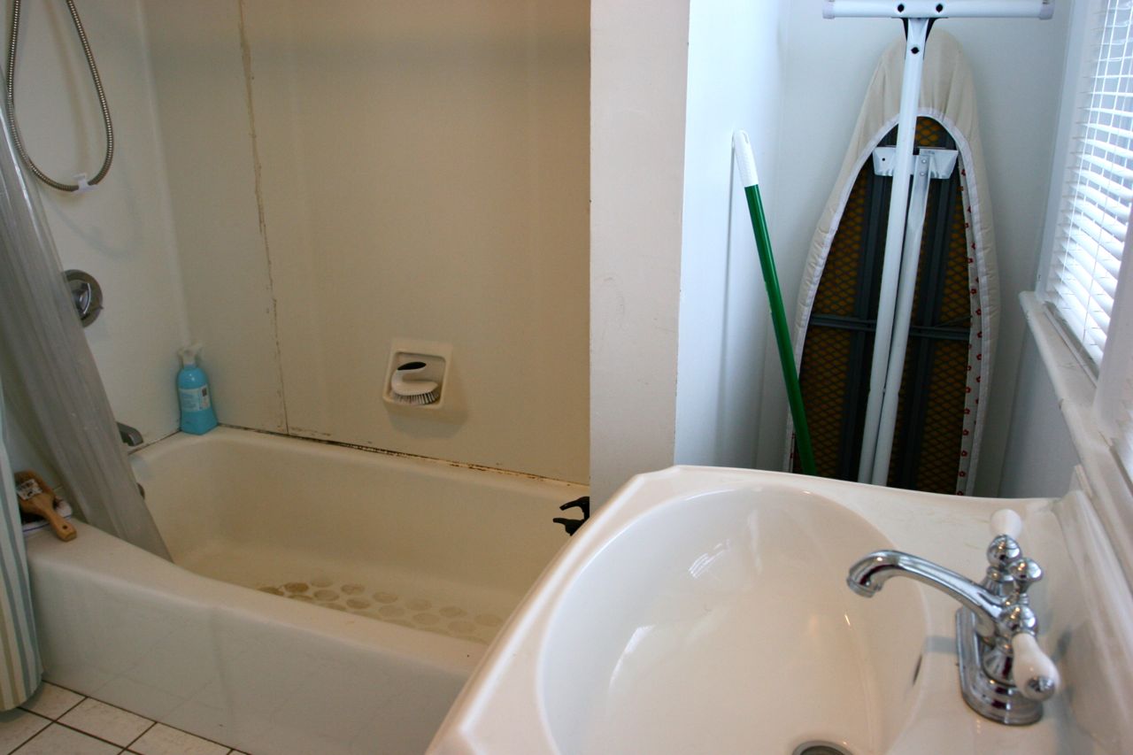 BEFORE, family bath, facing west. An awkward layout, plus a decaying tub surround, required a bit of a face-lift.
