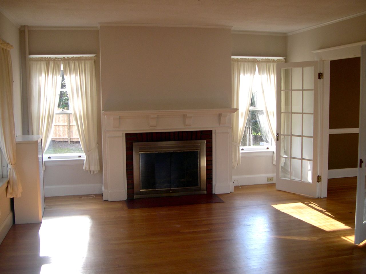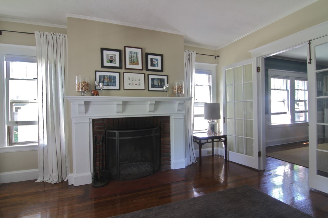 AFTER, living room, fireplace, facing south-west. Newly refinished flooring, darkened with a custom stain, add a modern richness to this handsome space.
