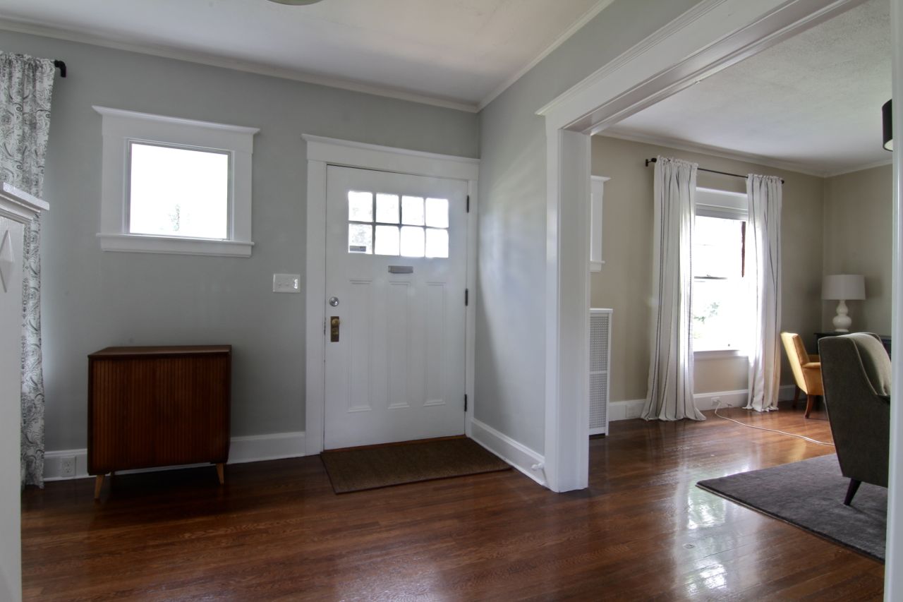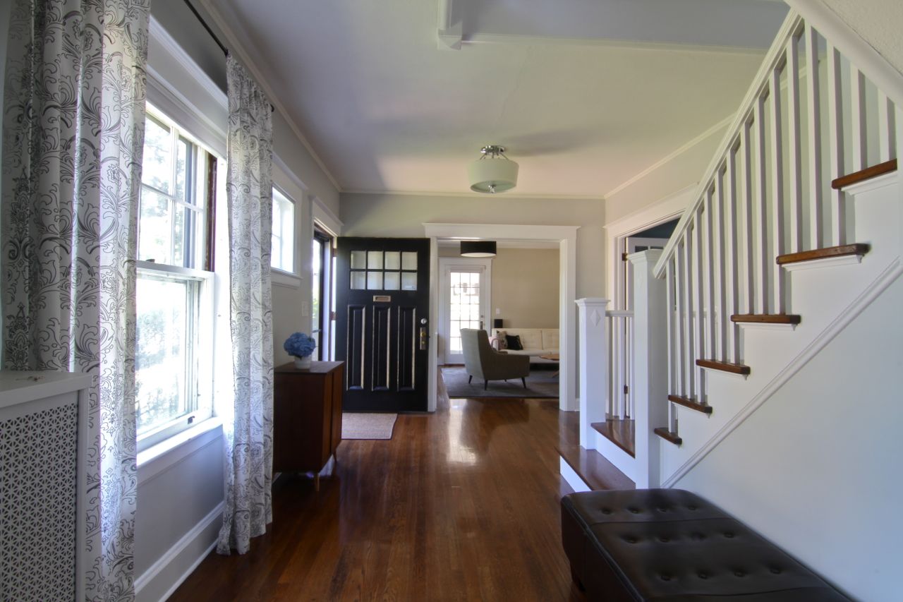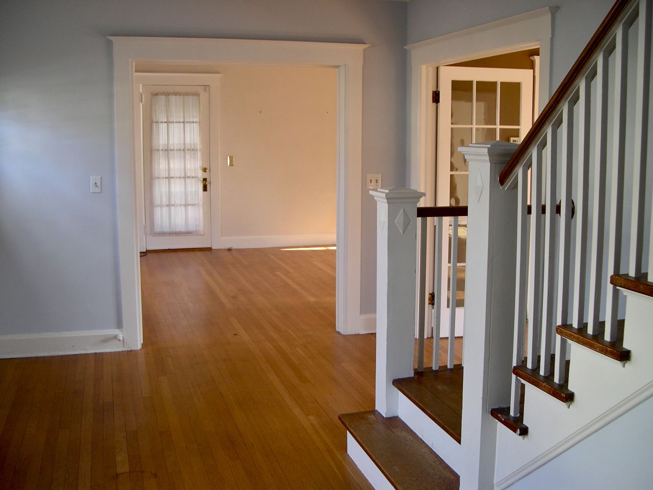AFTER, foyer, facing south-west. The floors on the entire first level were refinished, including the oak staircase and balustrade. All new paint on the walls and trim brighten and refresh the original details.