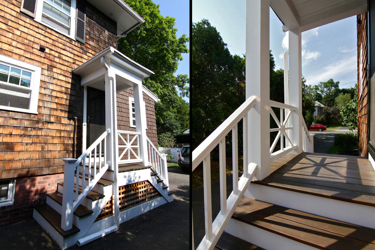Exterior porch stairs were re-built to reflect original railing details from 1920. Rich brown stain on porch and cedar stair treads extends the interior style to the exterior.